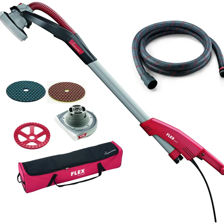 Flex GDE10 on seinä- ja kattohiomakone, Kirahvi, betonille, vaihdettavalla pääjärjestelmällä. Erittäin helppokäyttöinen, helppokäyttöinen ja kevyt kone, joka tekee työstä vähemmän rasittavaa ja enemmän ergonomista. Varustettu innovatiivisella vaihdettavalla pääjärjestelmällä, jossa on reunasegmentit. Hiomapään voi kiinnittää ja irrottaa yhdellä napsautuksella. Helppo ohjata, sillä paino jakautuu optimaalisesti moottorin ja hiomapään välillä. Suuret tilat ja jopa 3,40 m korkeat huoneet voidaan työstää GDE10:llä.