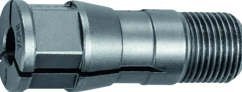 Ruostumattomasta teräksestä valmistettu kiristysholkki laipalla. Rakenne suojaa työkappaletta ja estää avaimen irtoamisen työkaluja vaihdettaessa.
