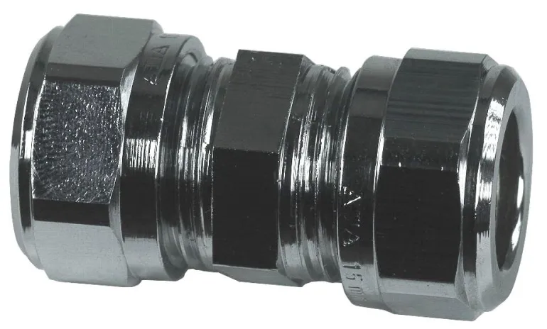 Suora kiristysrengasliitin tukiholkilla. Tehty messingistä, kromattu pintasuojaus