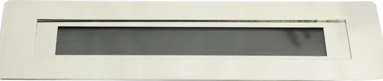 Messinkinen postiluukku, musta merkintäosa. Ulkomitat: 240×85 mm.