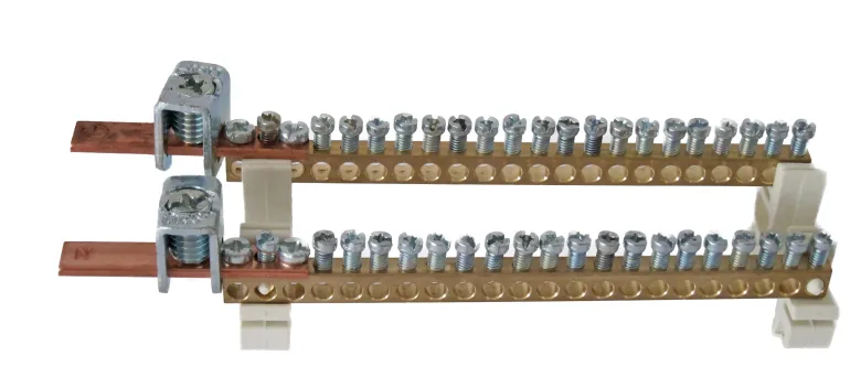 PE-N-kokonaisuus, joka koostuu ruuviliittimistä DIN-kiskoon asennusta varten (sisältyy PE-N-tarvikkeeseen NPB ja NNI-osaan).