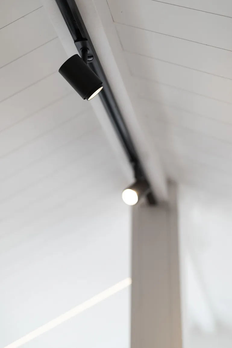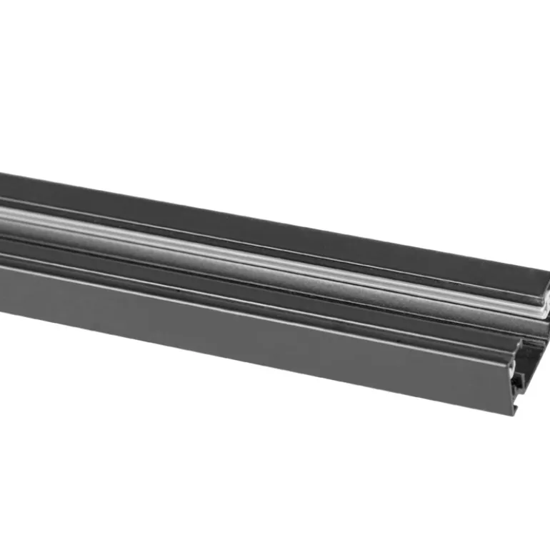Kahden metrin kisko mustana. Kisko on osa monipuolista kiskojärjestelmää Focus- ja Comfort-sarjan yksivaiheisille Hide-a-lite-tuotteille, joissa kukin osa myydään erikseen tarpeisiisi sopivana sekä kotiin että julkisiin tiloihin.