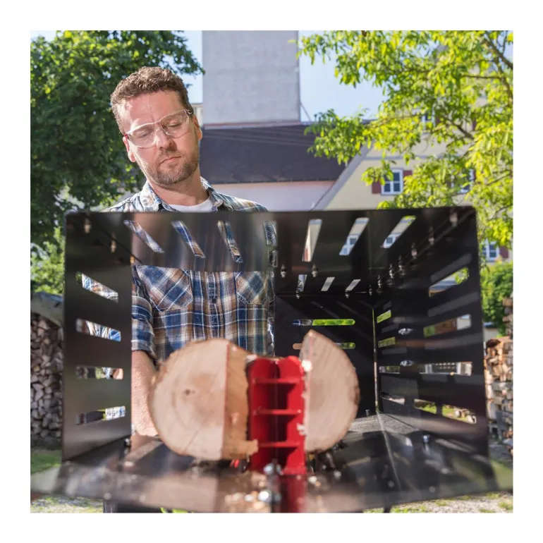 Vaikka halkomakoneessa on kahden käden turvaohjaus ja loukkaantumisriski on siten tavallista pienempi, suosittelemme käyttämään turvakenkiä, suojalaseja ja suojakäsineitä konetta käyttäessäsi. Varmista, että halkomakone on tukevalla ja tasaisella alustalla käytön aikana.