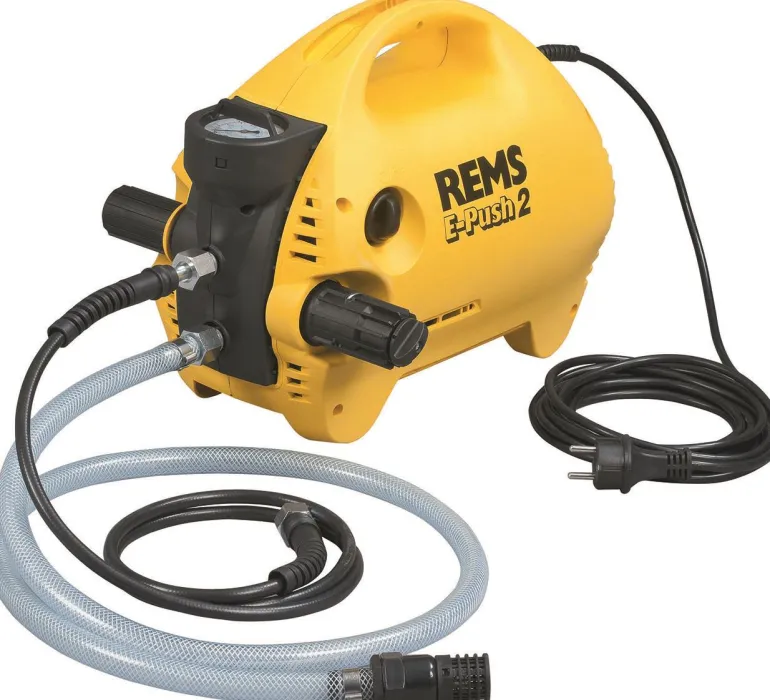 REMS E-Push on koeponnistuspumppu, jota käytetään saniteetti-, lämmitys-, aurinko- ja sprinklerijärjestelmissä, paineilma-, höyry- ja jäähdytysjärjestelmissä, öljyasennuksissa, kattila- ja paineastia-asennuksissa. E-Push on tukeva ja kompakti ja painaa vain 10 kg. Helppo kantaa. Kestävä, luotettava mäntäpumppu. Imuletkun paluuvirtauksen pysäytys estää imuletkua tyhjenemästä pysähdyksen jälkeen – tämä lyhentää imuaikoja.