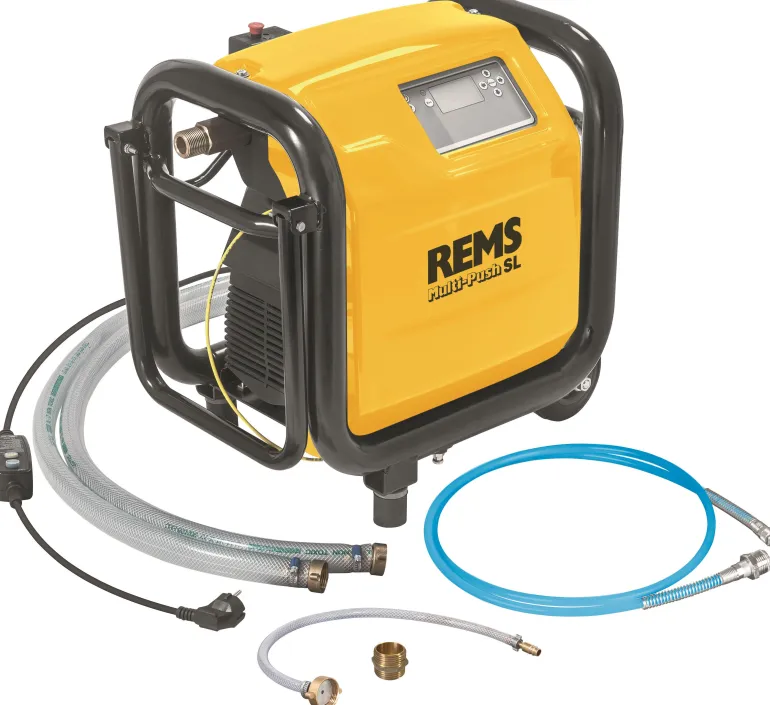 REMS Multi-Push SL SETTI on tehokas, kompakti, elektroninen 1500W:n koeponnistusyksikkö öljyttömällä kompressorilla. Putkistojen huuhteluun vedellä tai veden ja ilman seoksella, desinfiointiin, puhdistukseen, konservointiin. Putkistojen ja säiliöiden painetestaukseen paineilmalla tai vedellä, esim. juomavesiasennukset, jäähdytin- ja pintalämmitysjärjestelmät, kaasulaitteistojen painetestaus paineilmalla. Paineilmapumppuna kaikenlaisten säiliöiden valvottuun täyttämiseen paineilmalla, esimerkiksi paisuntasäiliöiden tai renkaiden pumppaamiseen, sekä paineilmatyökalujen käyttöön.