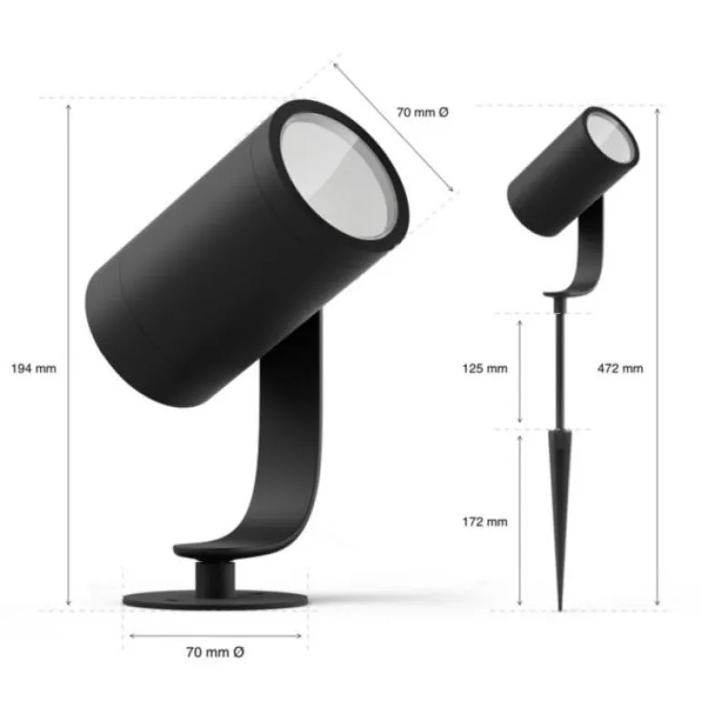 Philips Hue Lily on ulkokäyttöön tarkoitettu 8 W:n LED-spottivalo, joka tuottaa 800 lm:n valovirran. Liitä Lily-spottivalo haluamaasi vakiomalliseen pistorasiaan ja loihdi puutarhaan miljoonia erilaisia valkoisen tai värillisen valon sävyjä.