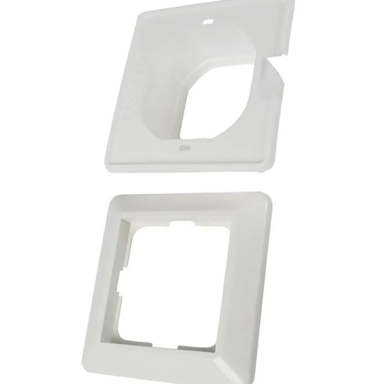 Kojesuoja, jonka mitat ovat 84 x 84 mm, käytetään yhdessä upotettujen kytkinten kanssa, kun halutaan suojausluokka IP44. Malli on yhteensopiva upotettujen kytkimien ja asennuskehyksen IP21 kanssa. Asennetaan niin, että syvennykset valumia varten ovat alaspäin.