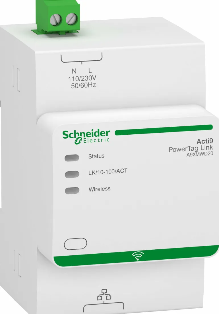 Schneider Acti9 on standardoitu keskitin, johon 20/100 PowerTag-energiasensorit voidaan liittää langattomasti. Lisäksi se toimii yhdessä ohjausyksikön A9XMC1D3 kanssa.