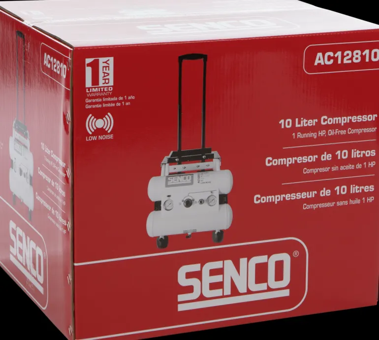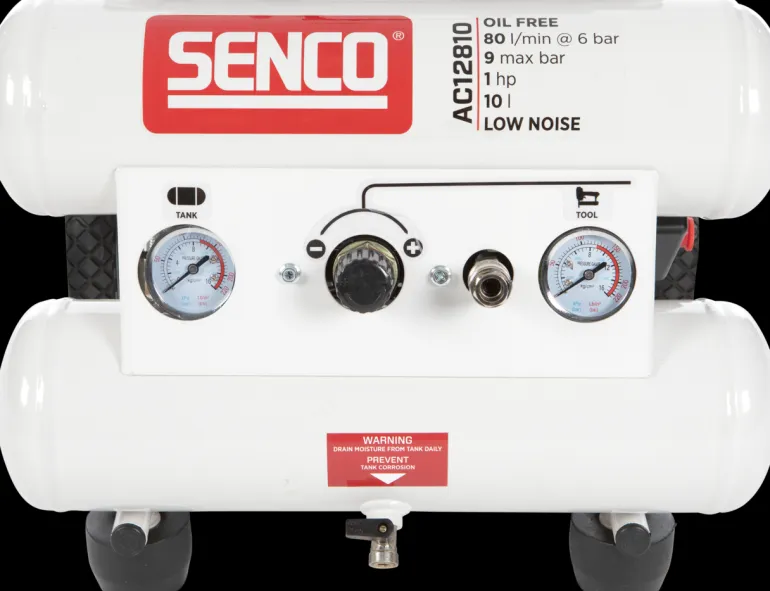 Aerfast AC12810 on kompakti, siirrettävä öljytön low noise -kompressori, jonka melutaso on vain 65 dB ja työpaine 7–9 baria.