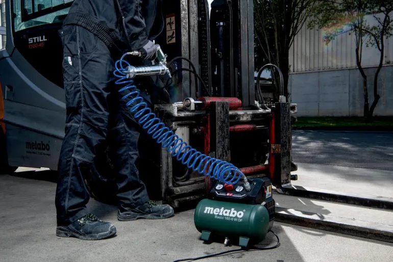 Metabo Basic 160-6 W OF on kätevä 6-litrainen kompressori tehokkaalla moottorilla yleiskäyttöön. Soveltuu niittaukseen, naulaamiseen, puhaltamiseen, renkaiden pumppaamiseen sekä käyttöön patruunaruiskujen, rasvapistoolien ja niittipihtien kanssa. Tätä öljytöntä mäntäkompressoria on helppo kuljettaa ja tilaa säästävä säilytys on helppoa taitettavan kahvan ja kompaktin rakenteen ansiosta. Näyttöpaneelissa on selkeät painemittarit säiliölle ja käyttöpaineelle. Säädettävä, mukautettu käyttöpaine painemittarilla varustetun paineenrajoittimen ansiosta. Ylikuormitussuoja suojaa moottoria ylikuumenemiselta ja kumitetut jalat tarjoavat hyvän vakauden myös kuljetuksen aikana. Basic 160-6 W OF on myös varustettu siipikahvallisella palloventtiilillä kondensaattin kätevää tyhjentämistä varten. Painesäiliöllä on 10 vuoden takuu läpiruostumista vastaan. Mukana yleiskäyttöinen pikaliitin.