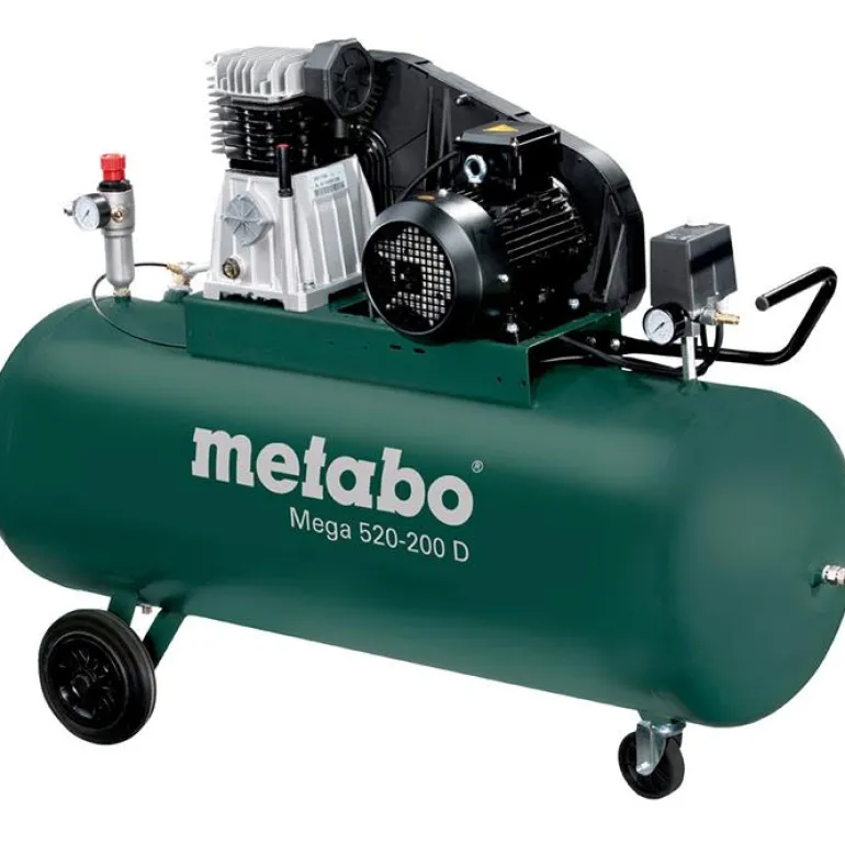 Metabo Mega 520-200 D on vahva kompressori, jonka suurin kierrosnopeus on 1 300 kierr./min. Vaativimpiin tehtäviin kehitetty kiilahihnakompressori. Varustukseen kuuluvat muun muassa peräti 200 litran säiliö ja lisäpainemittari, joka näyttää säiliön paineen.