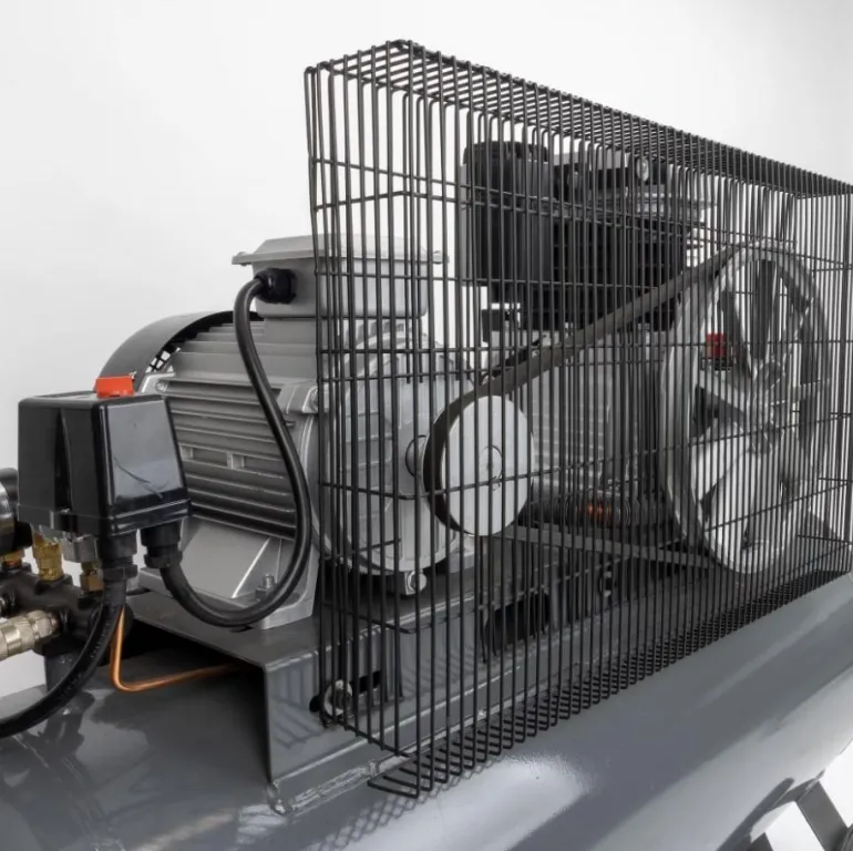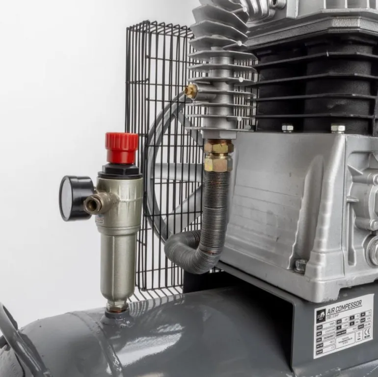 Kompressorissa on kompressorilohko, jossa on valurautasylinterit hiljaisen toiminnan ja pitkän käyttöajan takaamiseksi. Tehokas moottori on valmistettu huoltovapaasta alumiinista. Säädettävällä painekytkimellä, jossa on kaksi ulostuloa. Pistokkeen saa asentaa ainoastaan pätevä sähköasentaja. Kun kompressori on ajettu ensimmäisen kerran 8 baariin, anna kompressorin jäähtyä ja kiristä sylinterikannen pultit ristiin.