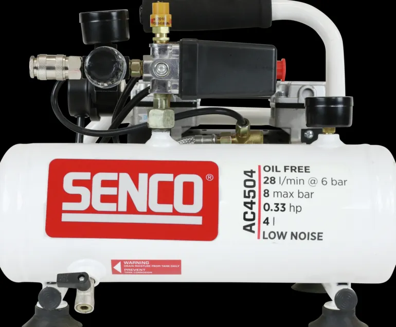 SENCO AC4504 on kompakti ja kannettava kompressori pienille naulaimille. Voimakas ja erittäin hiljainen (58 dB) matalilla kierroksilla toimiva moottori, joka tuottaa 8 baarin työpaineen. Jopa 45 l/min.