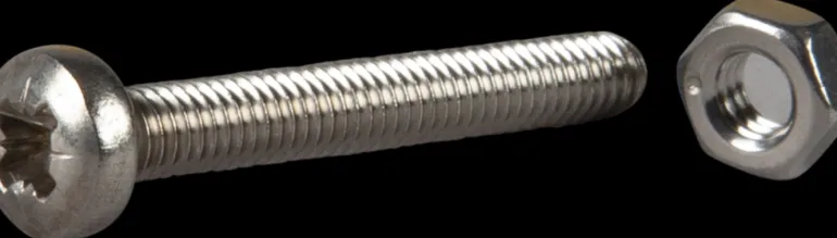 Koneruuvi, standardin DIN 7985 mukainen, pyöristetty pää, mutteri ja haponkestävä A4-pinnoite.