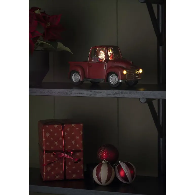 Konstsmide 4384-550 on vesitäytteinen auto, jossa on joulupukki ja koristevalaistus. Valaisimessa on 5h ajastin ja 3 paristoa (LR6/AA). Paristot eivät sisälly toimitukseen. Sopii ainoastaan sisäkäyttöön.