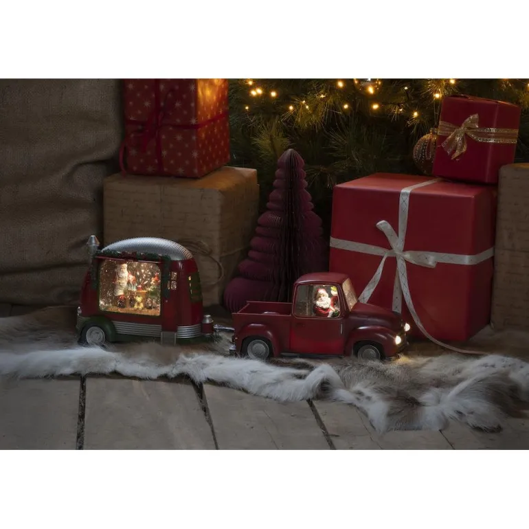 Vesitäytteinen auto, jossa on joulupukki ja koristevalaistus. Valaisimessa on 5h ajastin ja 3 paristoa.