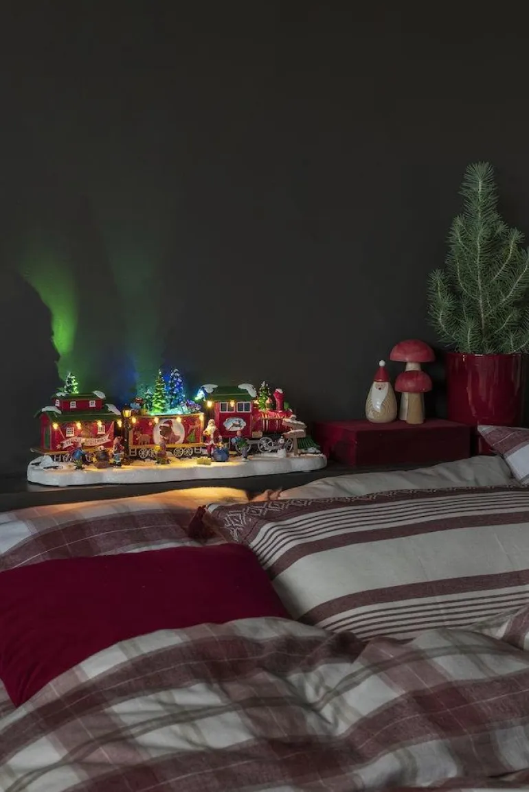 Pöytäkoriste, jossa on juna ja vaunut sekä moniväriset mikro LED-valot. 48 cm pitkä. Virtalähteenä paristot tai muuntaja halutessa.