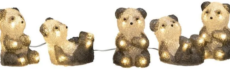 Viisi istuvaa akryylipandaa. Pandojen välinen etäisyys on 1 m ja läpinäkyvä liitäntäkaapeli on 5 m. Koristevalaisin sopii myös ulkokäyttöön.