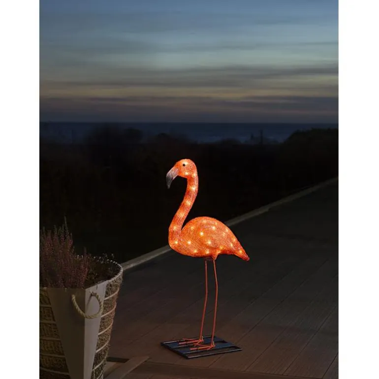 Konstsmide 6272-803 on flamingon muotoinen koristevalaisin. Akryyli. 48 valopistettä, valon väri: oranssi. Sopii ulkokäyttöön.