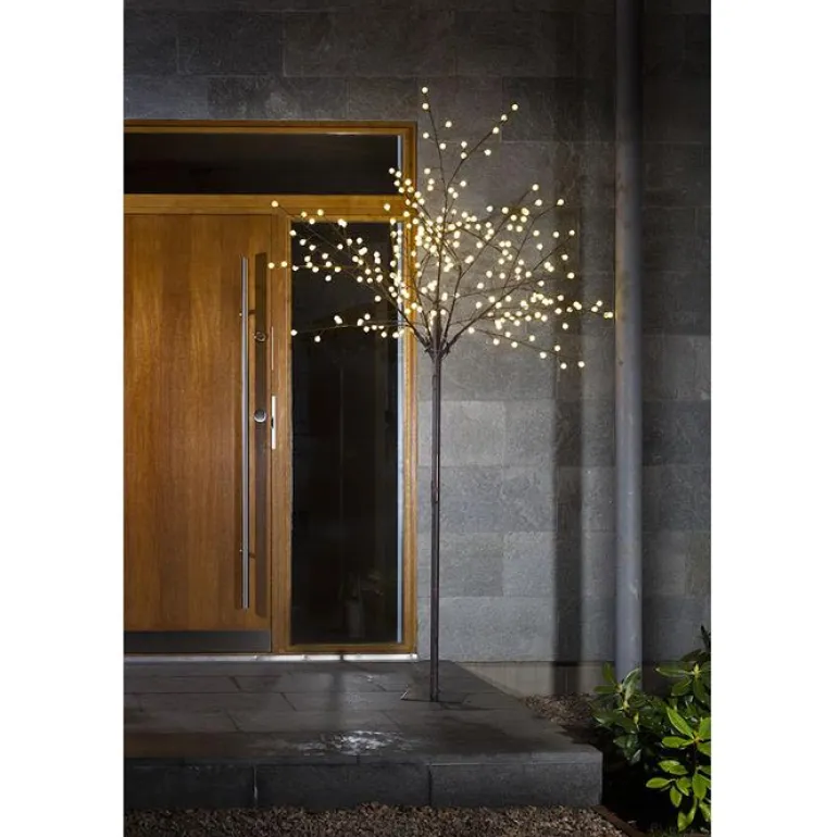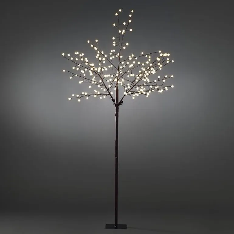Koristevalaisin, puun muotoinen, korkeus 250 cm. 240 lämpimän valkoista LED-valopistettä, leveä latva ja ruskea ”runko”. Sopii ulkokäyttöön.