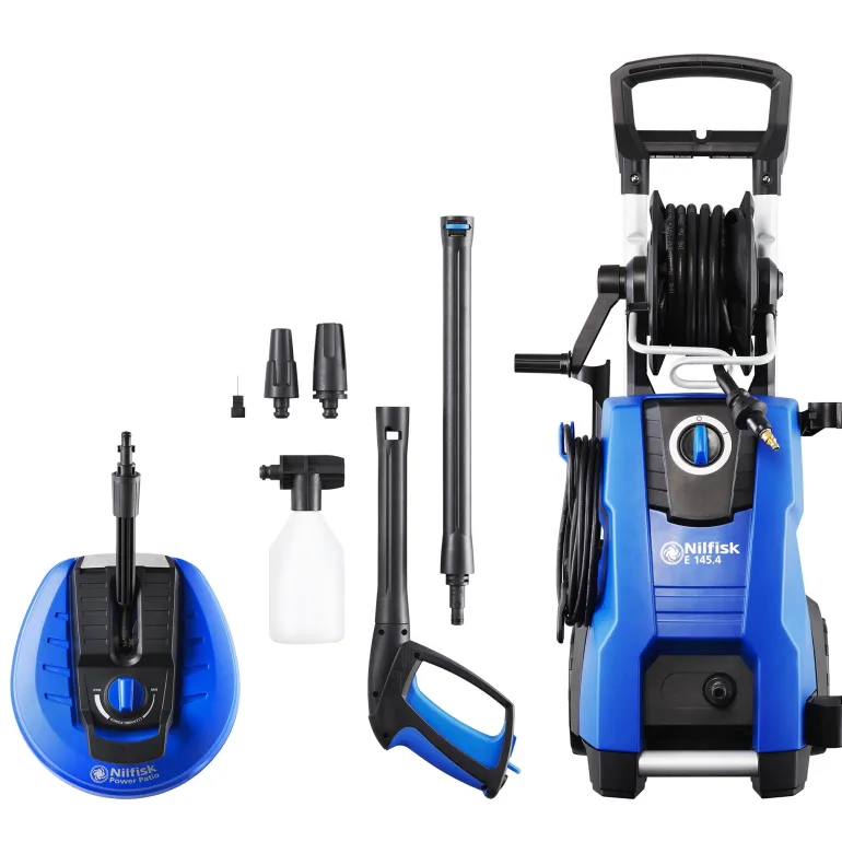 E 145.4-9 POWER X-TRA EU on useita ja tärkeitä pitkään kestävää työtä helpottavia ominaisuuksia, kuten teleskooppikahva, vankkatekoiset pyörät, pitkä paineletku, yhdellä kädellä käytettävä letkukela ja hiljaisen käyntiäänen varmistava kumikiinnitys. Suorituskyvyn parantamiseksi tässä Nilfisk-mallissa on Click&Clean-liitäntä erilaisia lisävarusteita varten. POWER mallissa on Power Patio-terassinpesulaite vakiovarusteena. X-TRA-mallia on helppo siirtää vaunurakenteen ansiosta.
