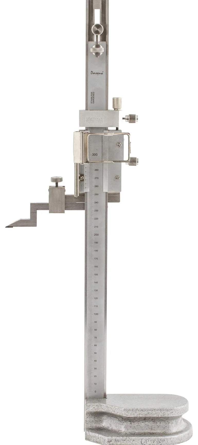 Dasqua 495189 on analoginen korkeuspiirtojalka, 300 mm. Soveltuva korkeuden mittaamiseen ja merkitsemiseen. Varustettu suurennuslasilla ja erityisen hienolla säätömekanismilla.