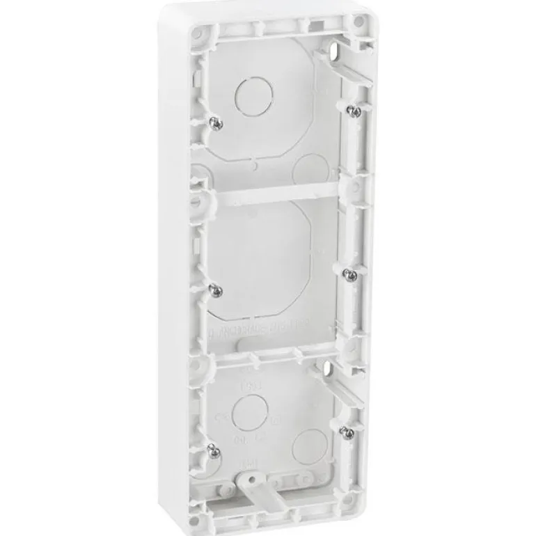 Elko EKO09675 3-lokeroinen korotuskehys mm. upotettavia kytkimiä, yhdistelmäpistorasioita ja heikkovirtalaitteita varten pinta-asennukseen. Voidaan asentaa kojerasiaan olemassa olevan asennuksen laajentamiseksi, kaapelin ulostulon yli tai kaapelilla syöttämiseen sivulta. Valmistettu halogeenittomasta kestomuovista.