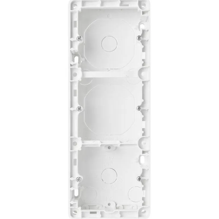 3-lokeroinen korotuskehys mm. upotettavia kytkimiä, yhdistelmäpistorasioita ja heikkovirtalaitteita varten. Voidaan asentaa kojerasiaan olemassa olevan asennuksen laajentamiseksi, kaapelin ulostulon yli tai kaapelilla syöttämiseen sivulta. Valmistettu halogeenittomasta kestomuovista, mitat 226 x 84 x 35 mm.