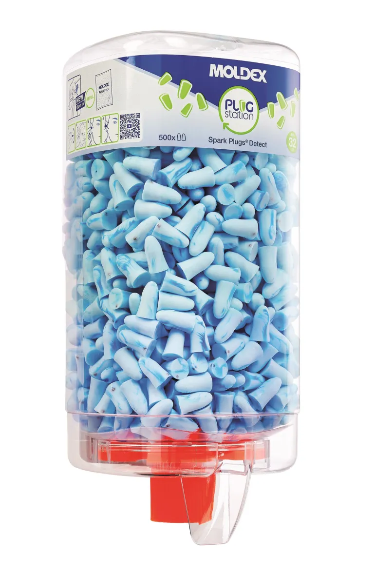 Moldex SparkPlugs -jäljitettävä korvatulppa, jossa on metalliosa korvatulpassa. Mukavat korvatulpat on valmistettu PU-vaahdosta ja ne suojaavat parhaiten pitkäaikaiselta altistumiselta. Pehmeä materiaali on helppo asettaa. Dip-anturijärjestelmä on valmistettu kierrätettävästä materiaalista. Korvatulpat pysyvät hygeenisinä, kun koko annostelija vaihdetaan jokaisella täyttökerralla. Toimitetaan annostelijassa, jossa on 500 paria korvatulppia.
