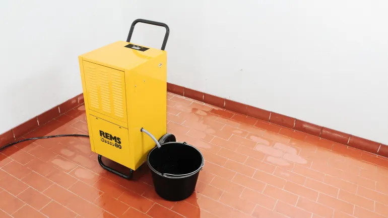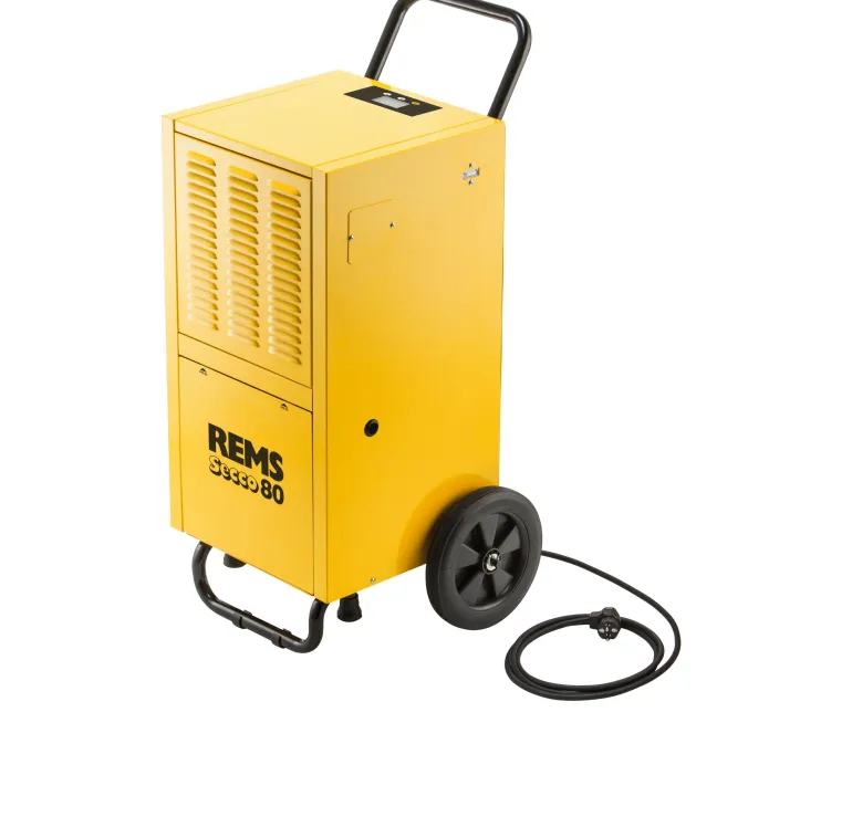 REMS Secco 80 Set on teolliseen käyttöön tarkoitettu sähköinen ilmankuivain. Tilojen kuivaamiseen, kellarien yms. kosteudenpoistoon sekä esim. betonin, muurauksen, laastin ja lattiamassan kuivatukseen. Jäähdytysyksikkö rotaatiomäntäkompressorilla ja lauhduttimen moottorilla 230 V, 50 Hz, 680 W, jossa on automaattinen kuumalla kaasulla toimiva sulatusjärjestelmä jatkuvaa käyttöä varten. Luotettava, hiljainen toiminta. Elektroninen ohjausyksikkö valaistulla 3″:n näytöllä ja muistitoiminnolla. Elektroninen hygrostaatti, käyttötuntilaskuri, tehonkulutusmittari. Ilmansuodatin. Tukeva teräspeltikotelo ja isoilla pyörillä varustettu rullattava teräsputkiteline. Kartonkipakkauksessa.