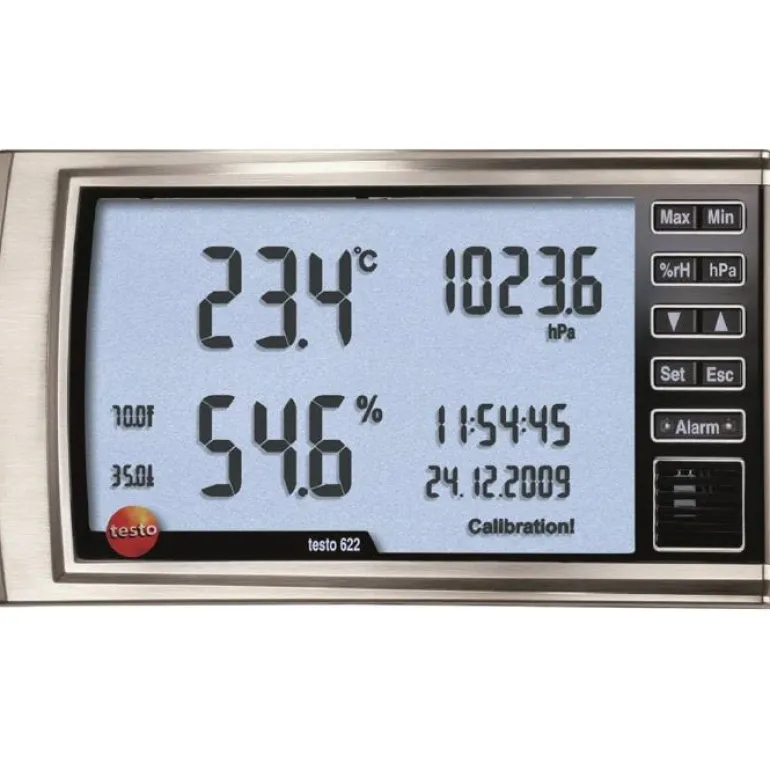 Testo 622 on hygrometri ilmanpaineen, kosteuden ja lämpötilan mittaamiseen. Ihanteellinen laboratorioilman mittaamiseen, kun ilmanlaatua on seurattava ja dokumentoitava laatusyistä. Suuri, helposti luettava näyttö näyttää nykyiset mittausarvot sekä päivämäärän ja kellonajan. Se tarjoaa kaikki tärkeät tiedot esimerkiksi tehdasprotokollaa varten hetkessä. Muistutustoiminto ilmoittaa käyttäjälle, kun on seuraavan kalibroinnin aika.