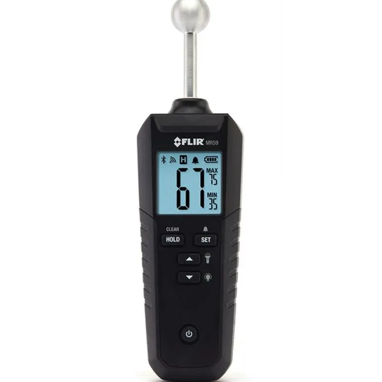 FLIR MR59 on palloanturilla ja langattomalla Bluetooth-yhteydellä varustettu kosteusmittari, jonka tulokset voi lukea kätevästi mobiililaitteesta FLIR Toolsin sovelluksen kautta. Havaitse kosteus jopa 100 mm:n syvyydestä jälkiä jättämättä.