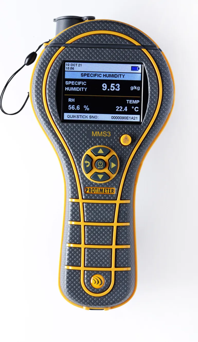 Protimeter MMS3 on nelitoimintoinen kosteusmittari kosteuden mittaukseen ja etsintään/paikantamiseen. Hyödyntää Protimeterin uusinta tekniikkaa ja toimintoja, sekä on muotoilultaan entistäkin vankempi ja kestävämpi. Setti sisältää Quickstick ST-anturin, BLD5060 -mittauskärjet, BLD4750 Hygrostick -anturin, BLD5802 -pidennyskaapelin, BLD5018 -syvämittauselektrodin, BLD5808 -pintalämpötila-anturin, aloitusoppaan (pika) ja laukun. Hyödyllinen apuväline kosteuden mittaamiseen/tarkastamiseen ja rakennuksiin liittyvään tarkastamiseen. Uudessa MMS3 -mallissa on bluetooth sisäänrakennettuna, mikä mahdollistaa yhdistämisen sovellukseen (IOS ja Android) helpompaa dokumentointia varten. Laite on varustettu sisäänrakennetulla itsekalibroinnilla ja sisäisellä muistilla jopa 10 000 mittaustulokselle. Paikannus-/hakusyvyys jopa 12 cm.