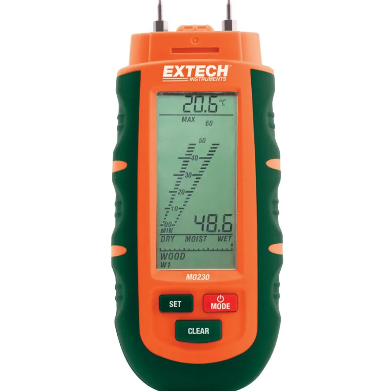 Kosteusmittari soveltuu puun, paperin, tapetin, kiven, pahvin, kipsin, betonin ja rappauksen mittaamiseen. Muisti sisältää kolme puuryhmää ja neljä rakennusmateriaaliryhmää: kalibroitu noin 150 puulajille ja 19 rakennusmateriaalityypille. Indeksitila sisältää ohjelmoitavat korkeat ja matalat arvot, jotka mahdollistavat kosteuden paikantamisen nopeasti vertailevaan mittaukseen nähden. Sisältää vaihdettavat kierteitetyt elektrodipiikit, iskunkestävän kotelon, automaattisen pois-kytkentätoiminnon, joka säästää paristovirtaa, sisäänrakennetun varaustason ohjauksen ja mittauksen varmennustestin.