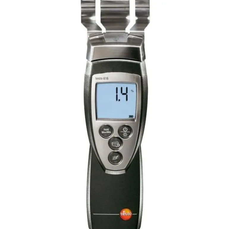 Testo 616 on kätevä ja luotettava kosteusmittari materiaaleja rikkomattomaan mittaamiseen ja kosteuden määrittämiseen materiaaleista. Laite mittaa dielektrisen kentän, joka läpäisee materiaalin 30-50 mm syvyyteen asti materiaalista riippuen. Selkeät muutokset mitatuissa arvoissa tekevät kosteusvaurioiden paikantamisen helpoksi, myös kuivien materiaalien, kuten muovimattojen, tapettien jne. läpi. Jos laite kalibroidaan asetustaulun mukaisesti, kosteuspitoisuuden prosentuaaliset mittaukset voidaan tehdä myös homogeenisille (sekoittamattomille) materiaaleille. Mittari toimii 9V IEC 6F 22 -akulla (mukana) ja akun käyttöikä on 60 tuntia.
