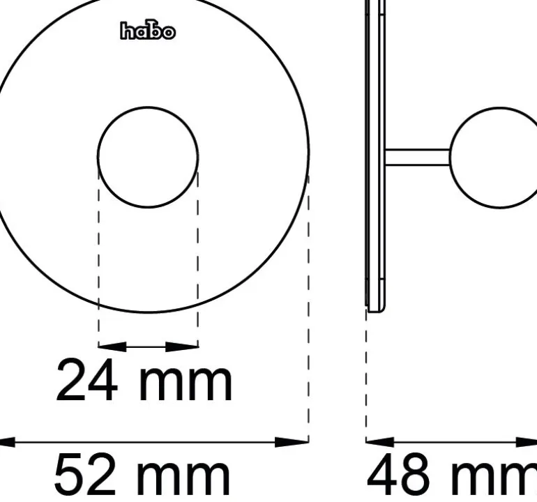 Tarrakiinnitteinen koukku kiillotettua ruostumatonta terästä, posliininuppi. Ulkonema 48 mm. Suositellaan kiinnitettäväksi sileään ja kovaan pintaan kuten kaakeli. Habo ei suosittele koukkua kiinnitettäväksi tapettiin tai vastaavalle pinnalle.