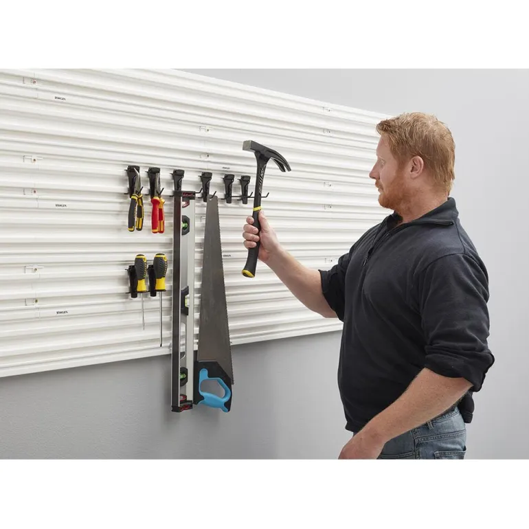 8 työkalukoukun sarja sopii yhteen STANLEY® Track Wall System -seinäkiskojen kanssa ja auttaa säilyttämään käsityökaluja ja muita kevyitä työkaluja siististi. Yksi koukku kestää 1–2,5 kg painon.