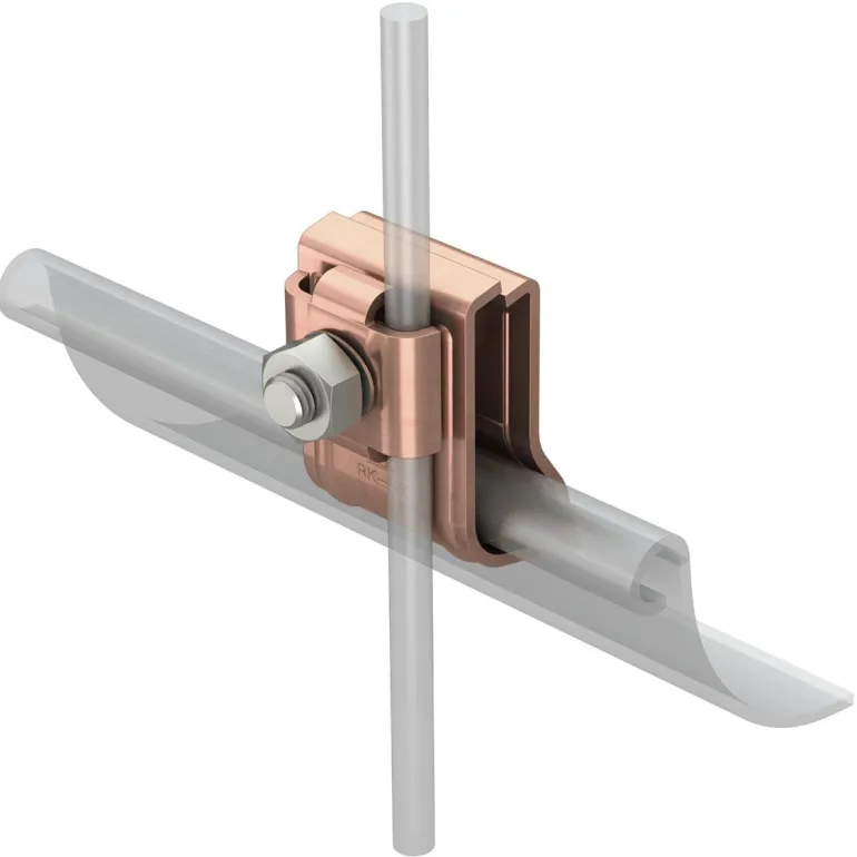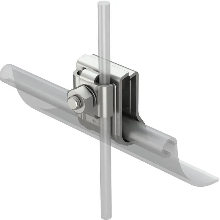 RK-FIX-kiinnike räystäskouruun, pitkittäis- ja poikittaissuunta. 2 pyöröjohtimelle Rd 8. Kaksoisohjauksella. Sopii kaikille reunan vahvuuksille (15–25 mm). 1 matalakantaisella ruuvilla M10 x 45. Esikiinnitys sadevesikouruun jousella. Hyväksytty EN SS 50164-2 -standardin mukaisesti