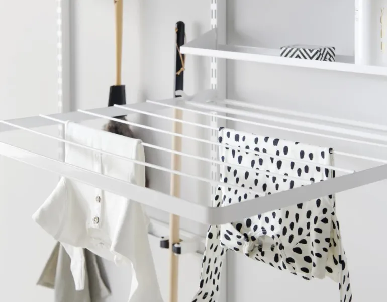 Päivitä pyykkihuoneesi käyttämällä Elfan taitettavaa kuivaustelinettä. Se voidaan helposti taittaa alas, kun sitä ei käytetä, säästäen tilaa. Ripustetaan kahden riippukiskon väliin.