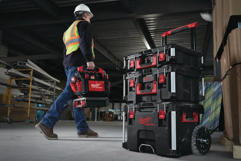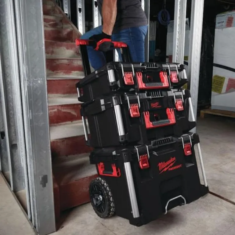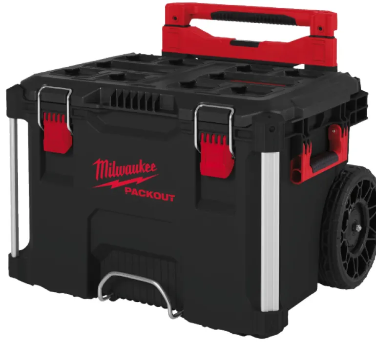 Milwaukee 4932464078 Packout on iskunkestävä kuljetuskärry, jossa on metallivahvikkeet ja maastopyörät. Kuljetuskärryn kapasiteetti on 113 kg.