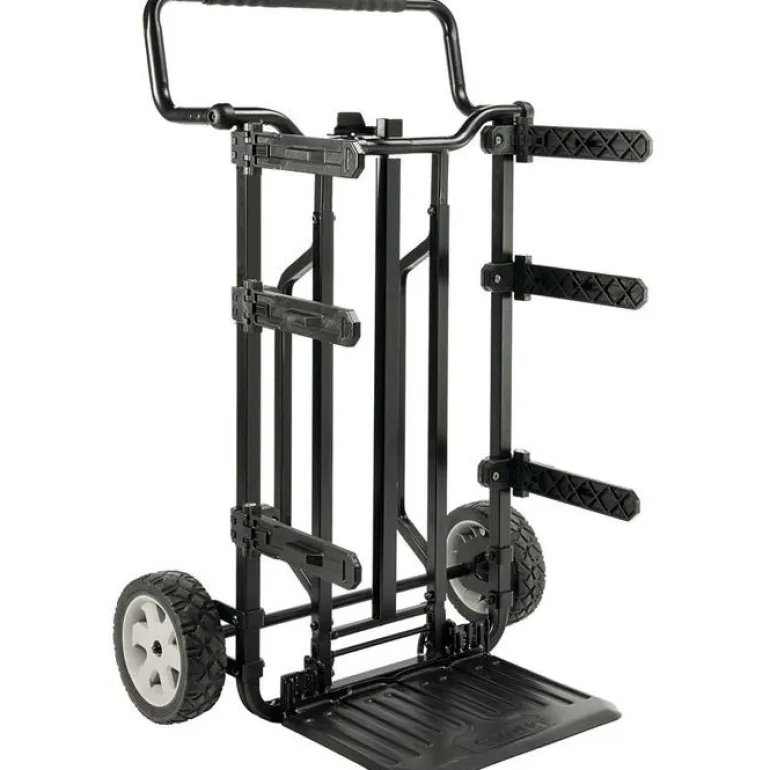 Dewaltin Tough System -säilytyslaatikoiden kuljetusvaunu helpottaa laukkujen käsittelyä. Varustettu vankoilla pyörillä.