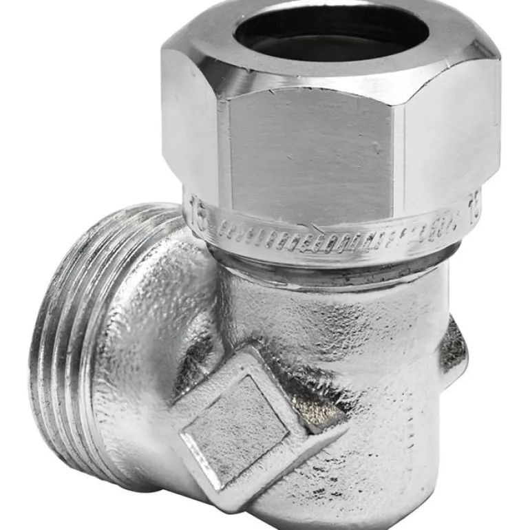 Kromattu 90 ° kulma-adapteri Ø 18×15 mm kupari-, teräs- ja PEX-putkille. Kun sitä käytetään tiettyjen PEX-putkien sekä ohutseinäisten kupari- ja teräsputkien kanssa, on käytettävä tukiholkkeja. Adapteri koostuu ruuviosasta, kiristysrenkaasta ja mutterista.