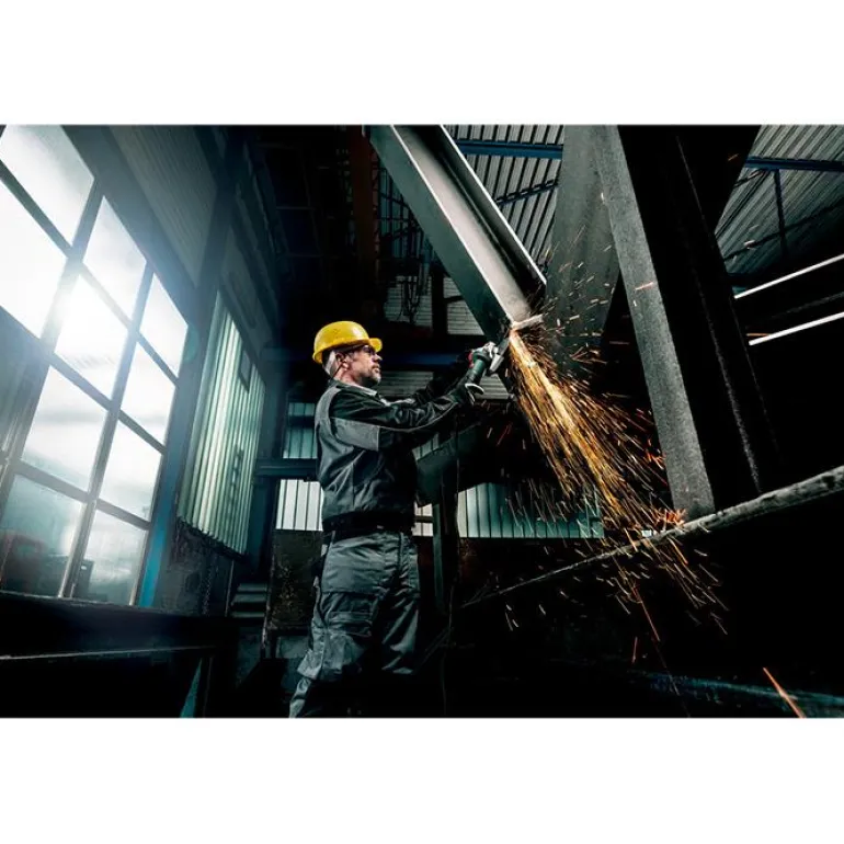 - Tehokas kone, jopa 1900 W, teollisuuden hitsaussaumojen työstämiseen samalla leikkaussyvyydellä kuin isolla kulmahiomakoneella (Ø 230 mm), vaikka paino on vain puolet ison koneen painosta
