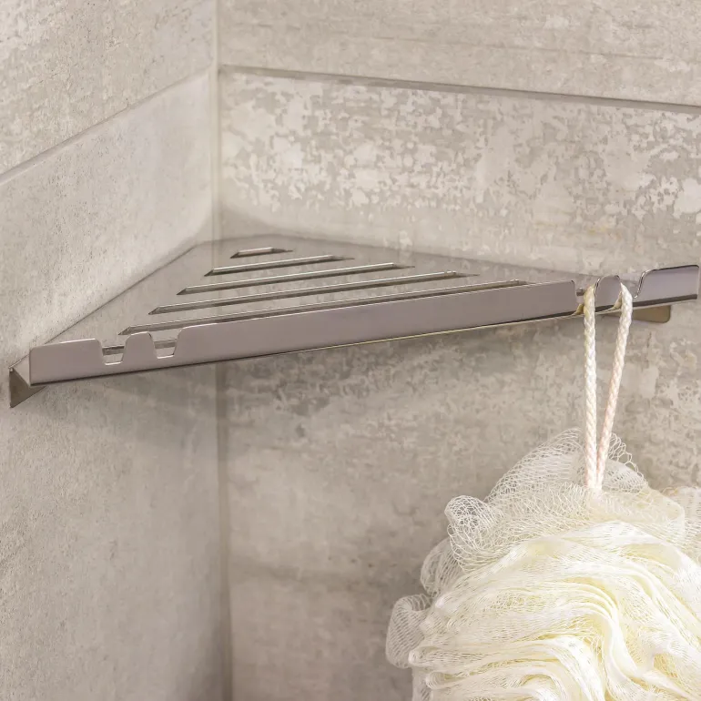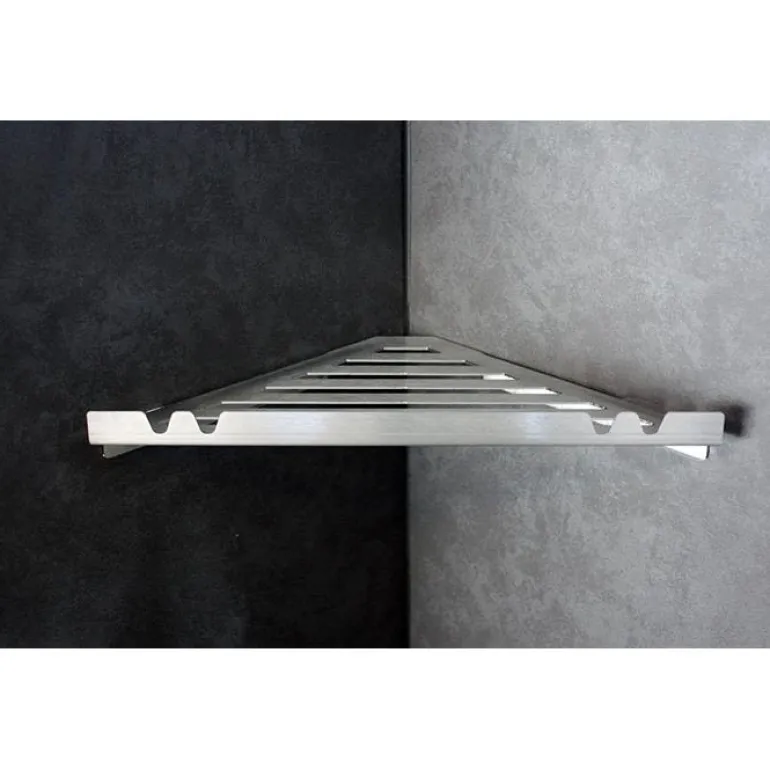Kulmahylly kylpyhuoneeseen ruostumattomasta teräksestä. Mukana liima asennusta varten sekä puhdistussarja.