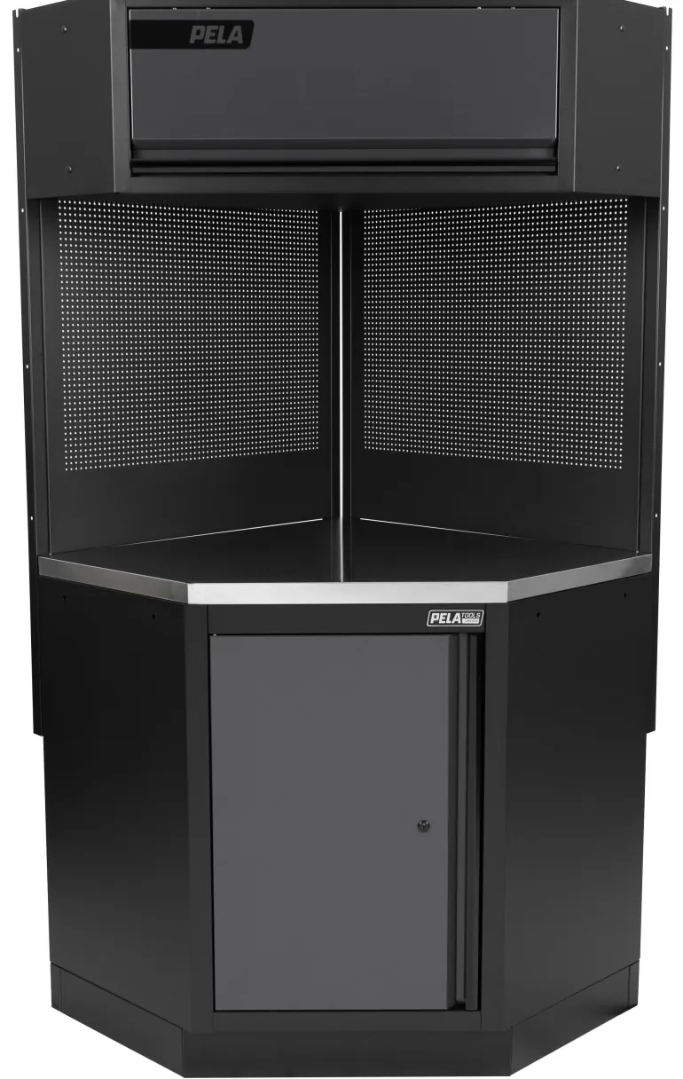 PELA 546482 kulmaosa PELA 2.0-työpistekalusteelle 546214. Kulmaosan mitat (PxLxK): 1270x965x2005 mm. Kulmakaapissa ala- ja yläkaapit, ruostumattomasta teräksestä valmistettu työtaso ja kaksi työkalutaulua. Lähin värikoodi: RAL 3001.