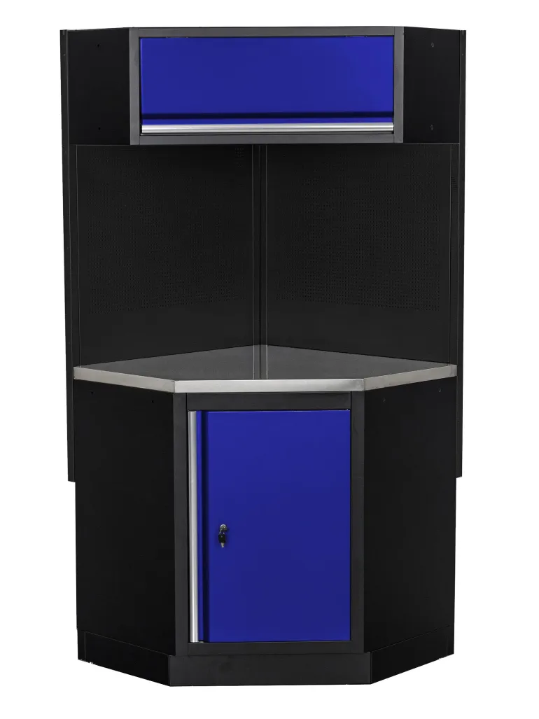 PELA 531999 on 1270x965x2005 mm sini/musta autotallikalusteen kulmaosa, joka koostuu ala- ja yläkaapista, ruostumattomasta teräksestä valmistetusta työtasosta ja kahdesta työkalutaulusta. Sinisen lähin värikoodi on RAL 5005.