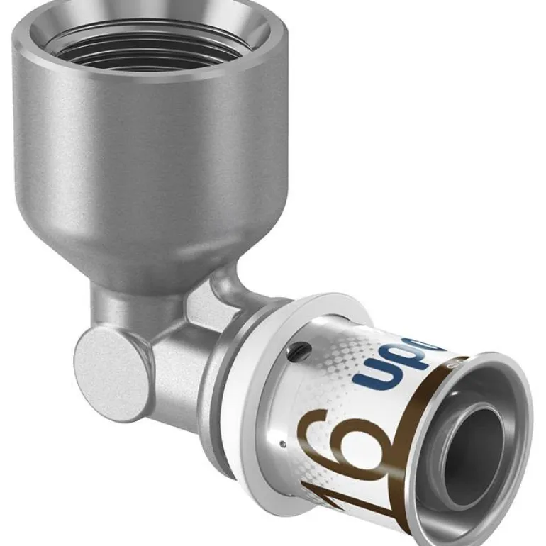 Kulmaliitin tinattua sinkkikadonkestävää messinkiä, ruostumattomasta teräksestä valmistetulla puristusholkilla. Taivutuskulma 90° ja varustettu puristusholkilla ja sisäkierteellä. Liittimessä on puristusohjain, puristusilmaisin ja liitinkoon värimerkintä.