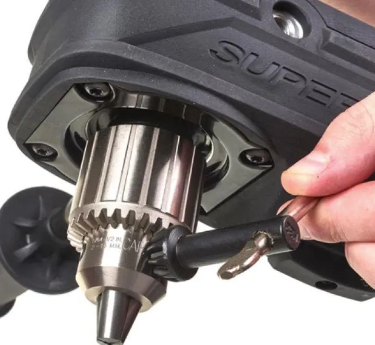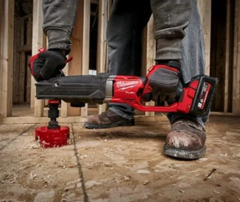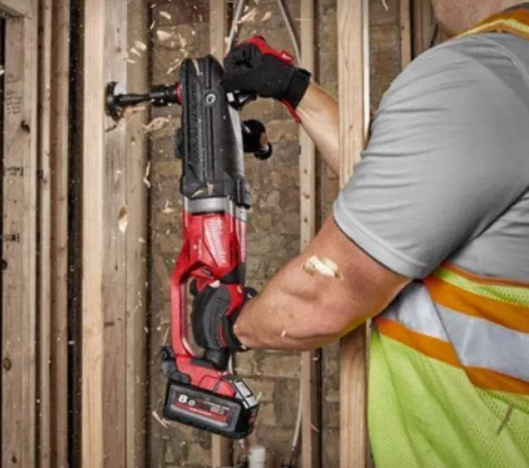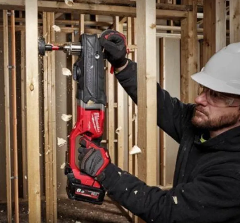 Kulmaporakone, jossa on LED-valaisin ja akkuilmaisin. Hiiliharjaton moottori tuottaa vakiovoiman ja -paineen, kapasiteetti jopa 152 mm:n reikien poraamiseen.