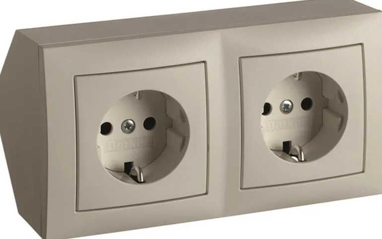 Kulmarasia, jossa on 2 esikytkettyä 1-osaista pistorasiaa pinta-asennukseen kulmaan tai kaapin alle. Liitännät takaa tai lyhyiltä sivuilta.