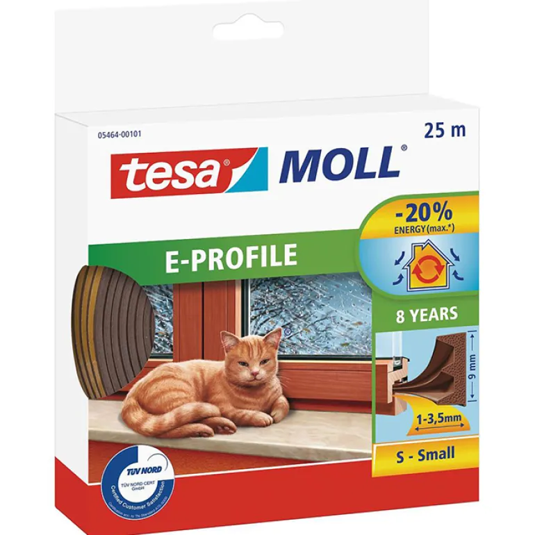 Tesa E-list 05464-00100-00 on itsekiinnittyvä kuminen tiivistenauha itse suoritettavaan tiivistämiseen. Säätä kestävä ja vedolta suojaava tiiviste sopii useisiin oviin ja ikkunoihin. Se on helppo kiinnittää, ja sen voi irrottaa nopeasti korjaamista tai vaihtamista varten. Erittäin luja kumiprofiili kestää lähes kaikkia sääolosuhteita, ja sen takuuaika on vähintään 8 vuotta. Tiivistenauha kestää UV-säteilyä ja otsonia sekä äärimmäisiä lämpötiloja -50 °C – +60 °C. Sillä voi tiivistää kaikki 1–3,5 mm:n raot ja säästää jopa 20 % energiakustannuksia.